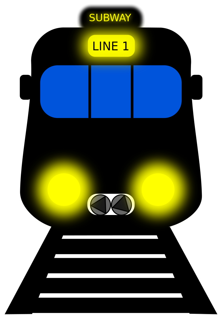 This features a black subway train with a blue window, traveling down the tracks. The train is moving forward and has yellow lights on its front, which are illuminated to guide passengers. The train's design suggests that it is part of a public transportation system, providing efficient and reliable service for commuters in the city. The presence of the yellow lights adds an element of safety and visibility, ensuring that the train can be seen clearly by both passengers and other vehicles on the tracks. Overall, this illustration captures the essence of modern urban transportation and its role in connecting people to their destinations.