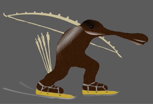 This features a unique and creative illustration of an animal, possibly a duck or a bird, riding on a pair of skis. This whimsical scene is reminiscent of the famous painting "The Garden of Earthly Delights" by Hieronymus Bosch. The animal appears to be skillfully navigating its way downhill while holding an arrow in its mouth, adding a playful and imaginative touch to the image.