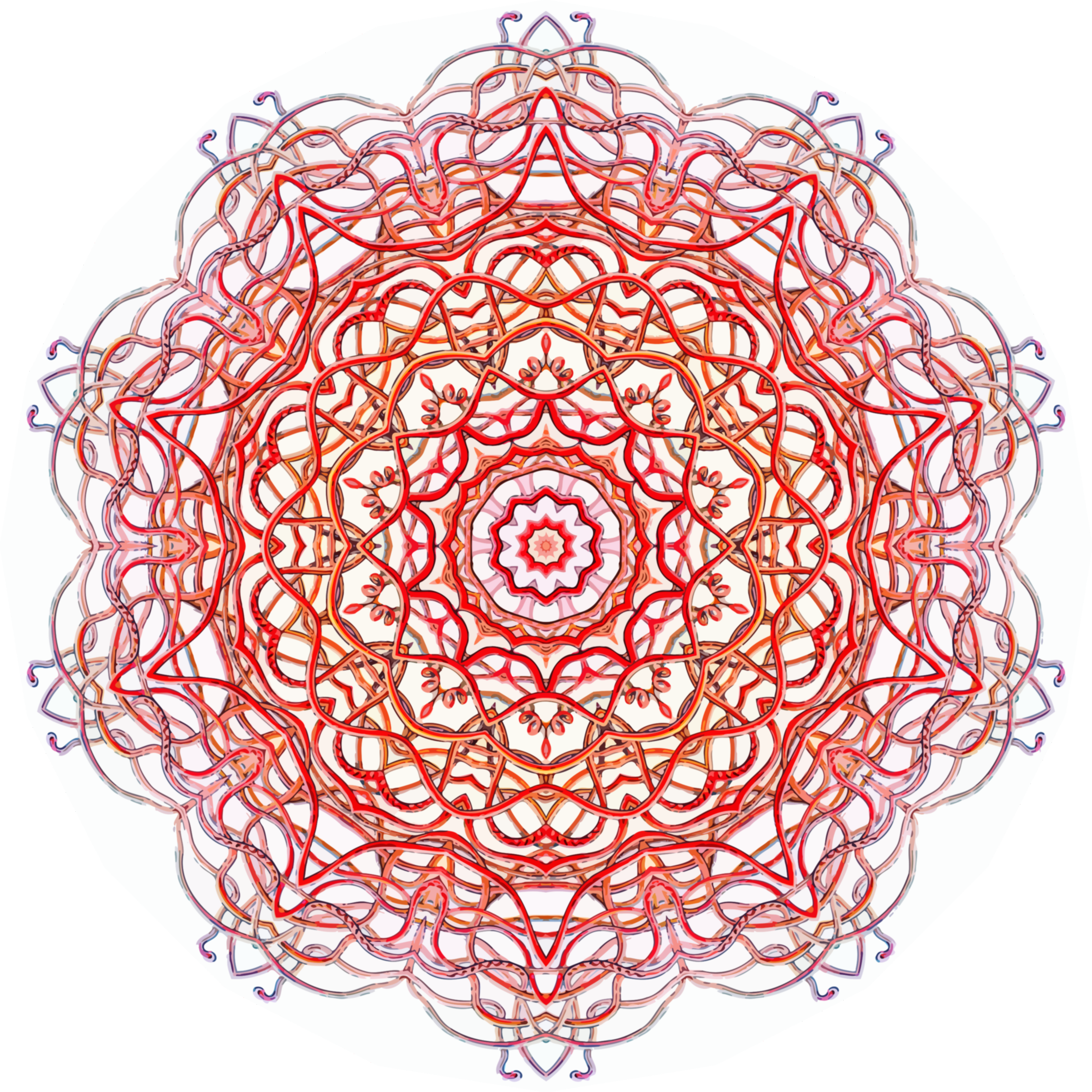 This features a large, intricate red and white design that resembles an ornate pattern or a mandala. This artistic piece is composed of numerous interconnected lines and shapes, creating a visually striking and complex composition. The colors used in the design are predominantly red and white, with some orange accents adding depth to the overall appearance. The intricate patterns and vibrant colors make this design an eye-catching focal point for any space it occupies.