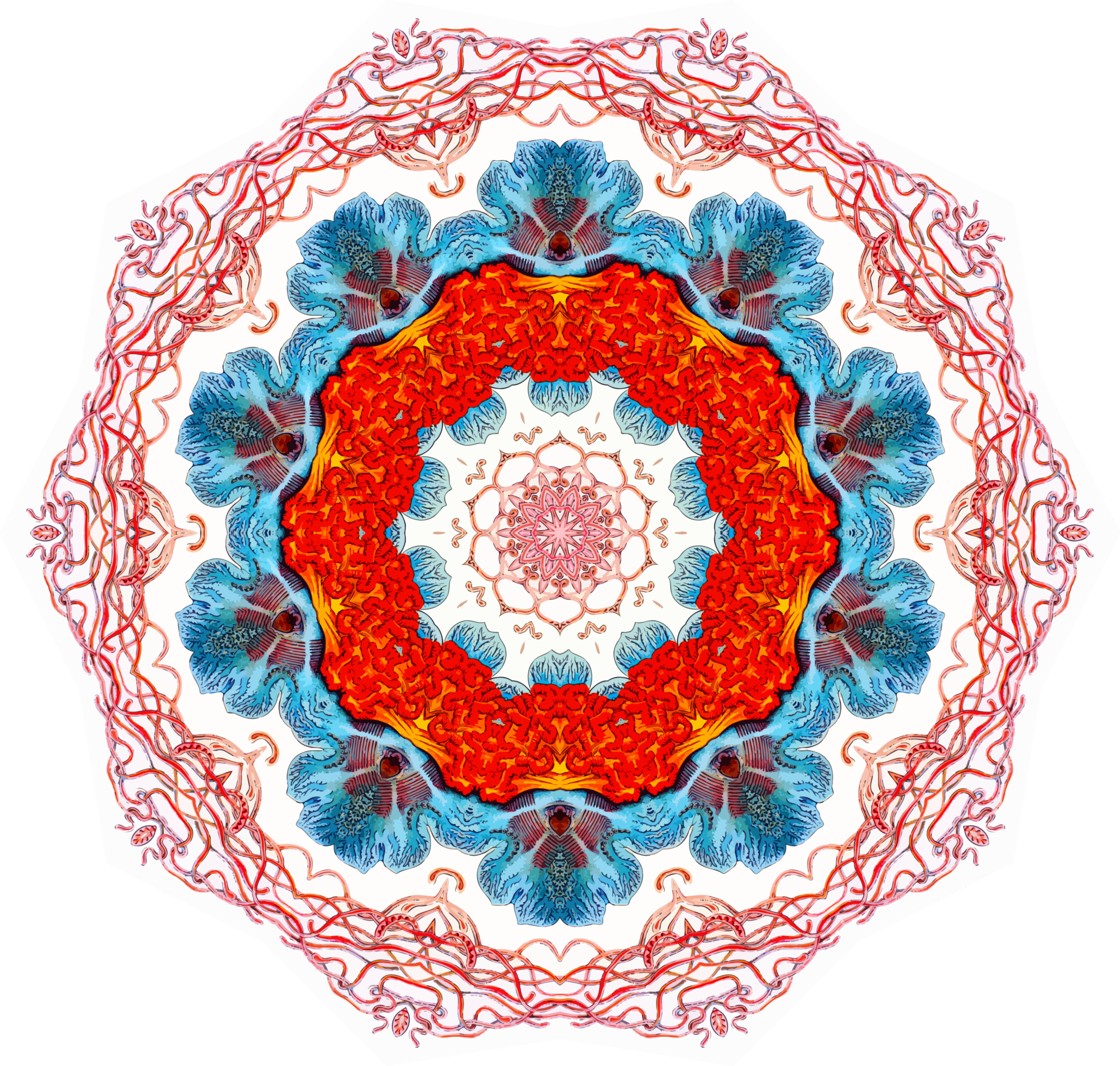 This features a large, intricate design that resembles an ornate mandala. This artistic piece is composed of various shapes and colors, including reds, blues, yellows, and greens. The design appears to be inspired by the work of Ernst Haeckel, who was known for his detailed illustrations of marine life. The mandala's central point is surrounded by a circular pattern that adds depth and complexity to the overall composition. This captivating artwork showcases the artist's skill in creating an intricate and visually stunning piece using various shapes and colors.