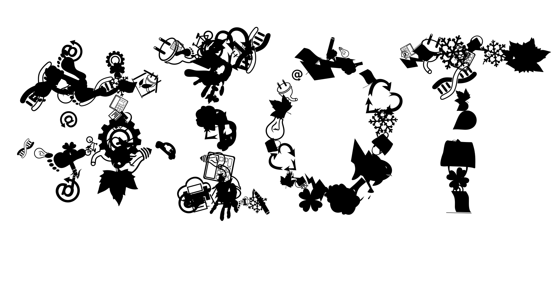 This features a large white word "SOT" with various decorative elements surrounding it. These decorations include several birds, some of which are positioned above the letters and others below them. There is also an umbrella located near the top right corner of the image. Additionally, there are two clocks in the scene, one on the left side and another towards the center. The overall composition creates a visually interesting and unique display.