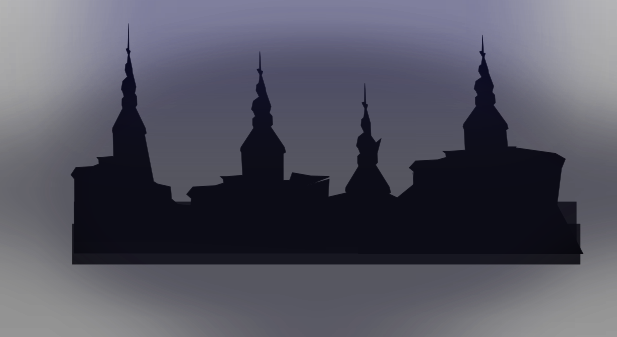 This features a black and white silhouette of a city skyline at night. There are three prominent buildings in the scene, with one located towards the left side, another in the middle, and the third on the right side. These buildings have tall spires that extend upwards into the sky, creating an impressive architectural display against the dark background. The silhouettes of these buildings create a striking contrast against the night sky, making for a visually captivating scene.