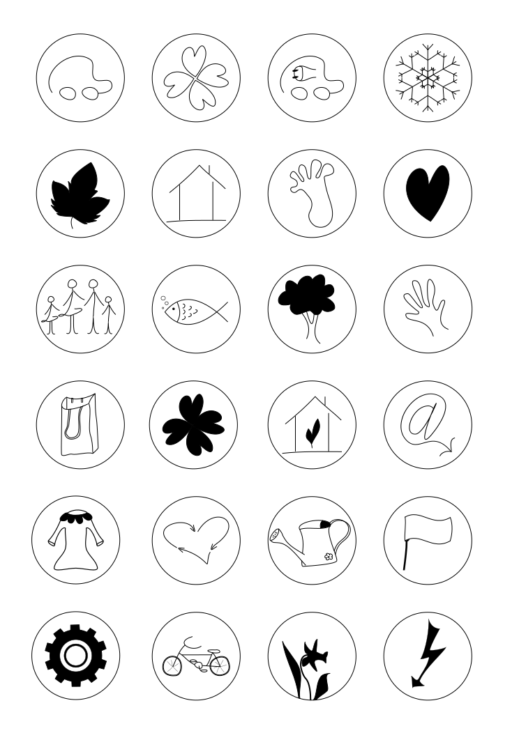 This features a collection of twenty-four black and white icons, each with an icon in the center. These icons represent various themes such as cars, fish, plants, a home, a family, and hearts. Each icon is depicted within a circle, creating a visually appealing arrangement. The icons are organized neatly, making it easy to identify and understand their meanings. This collection of symbols can be used for educational purposes or as decorative elements in various settings.