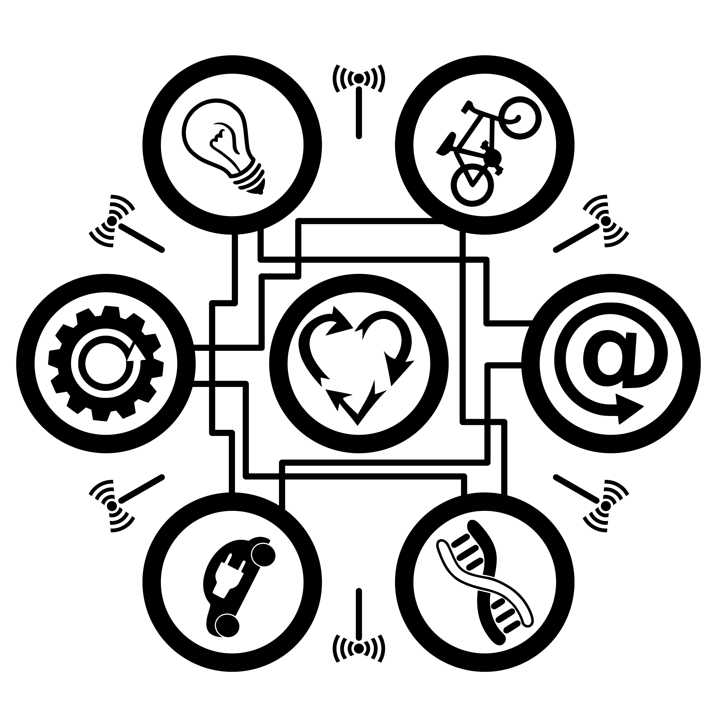This features a collection of seven icons, each contained within a circle border. These icons are interconnected in various ways, creating an intricate web of connections between them. Some of the icons include a bicycle, a heart, and a light bulb, among others. The overall composition of the image suggests that it may be related to a concept or idea involving these symbols.