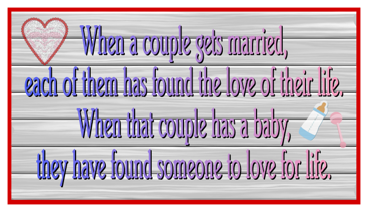 This features a heart-shaped sign with a red border, which reads "When a couple gets married, each of them has found the love of their life. When that couple has a baby, they have found someone to love for life." This sentimental message is displayed on a wooden surface, possibly a wall or table. The sign's design and content convey a sense of love and commitment between couples, emphasizing the importance of family and togetherness in their lives.