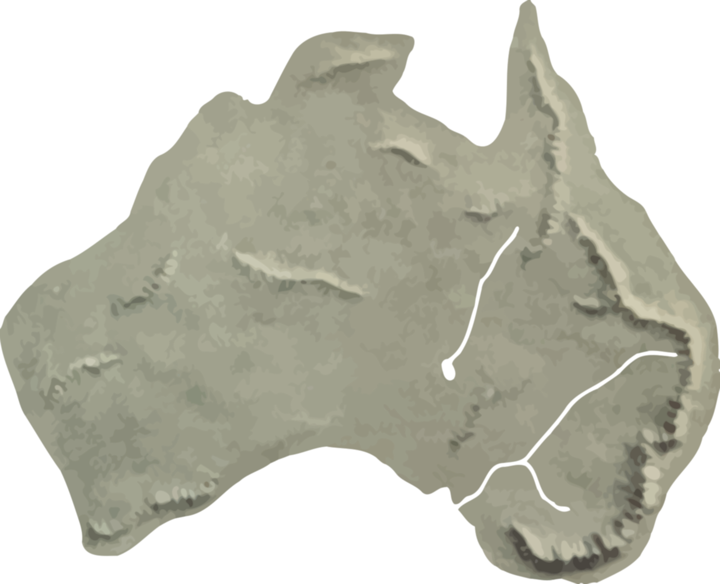 This features a large, detailed map of Australia. It is an artistic representation of the country's terrain and coastline, with mountains and valleys depicted in various shades of brown. A prominent feature of this map is the outline of the continent itself, which stands out against the surrounding landscapes. The intricate details on the map make it a captivating visual representation of Australia's geography.