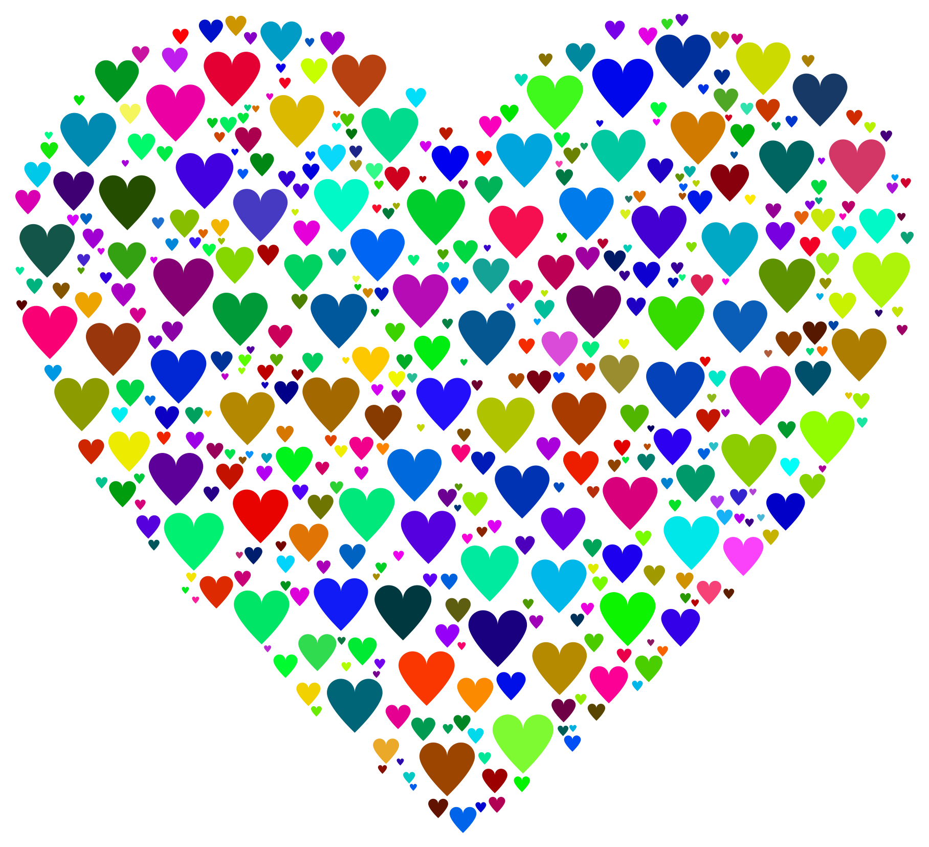 This features a large, colorful heart made up of smaller hearts. These smaller hearts are scattered throughout the scene in various sizes and colors, creating an eye-catching display. The heart is predominantly pink, but it also includes other colors such as green, yellow, blue, orange, and purple. This vibrant arrangement showcases a diverse range of hues that come together to form a visually appealing and unique design.