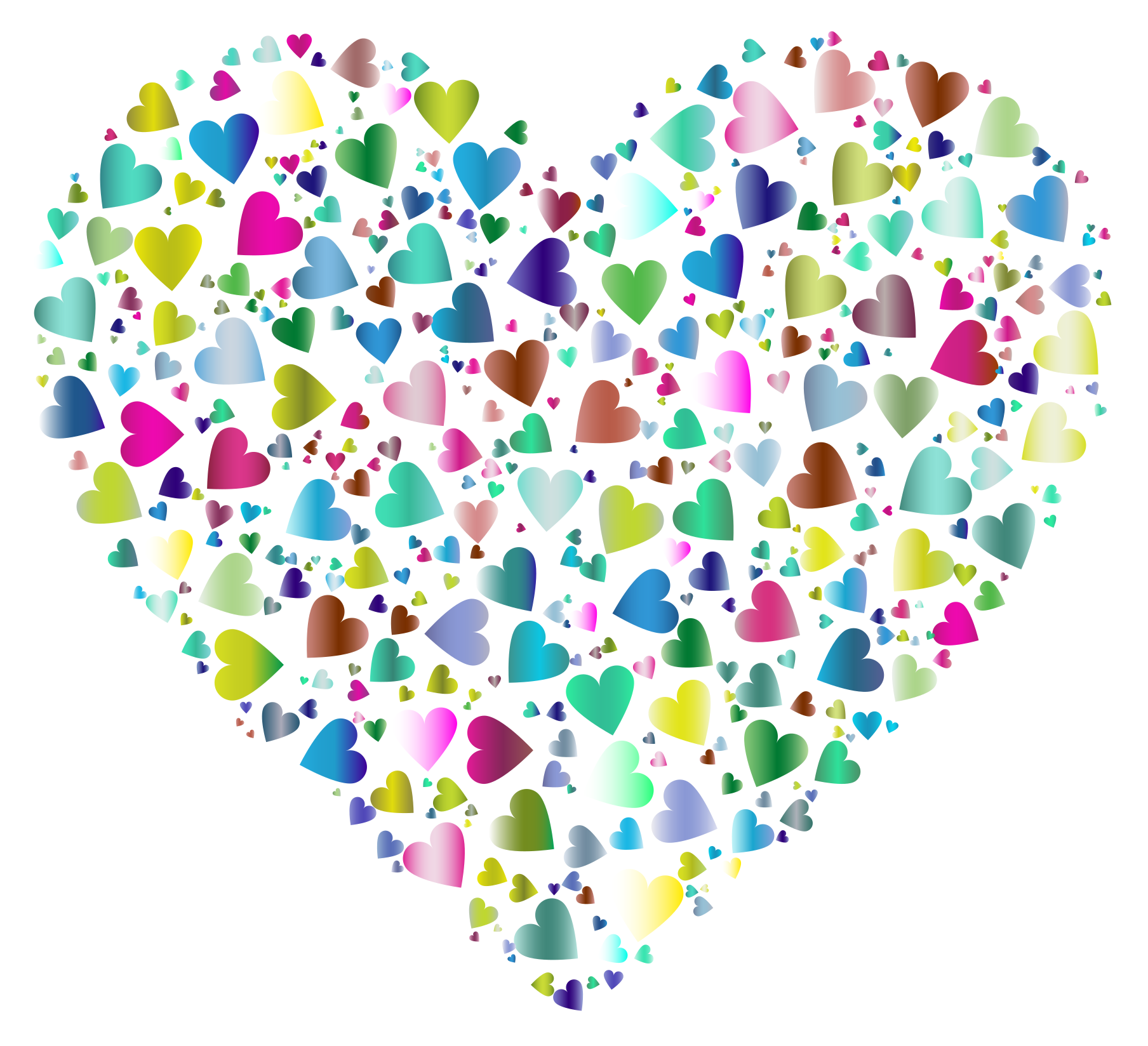 This features a large heart made up of many smaller hearts. These smaller hearts are colorful and shiny, creating an eye-catching display. The hearts come in various sizes and shapes, adding depth and texture to the overall design. This creative arrangement showcases love and affection through the use of these charming heart pieces.