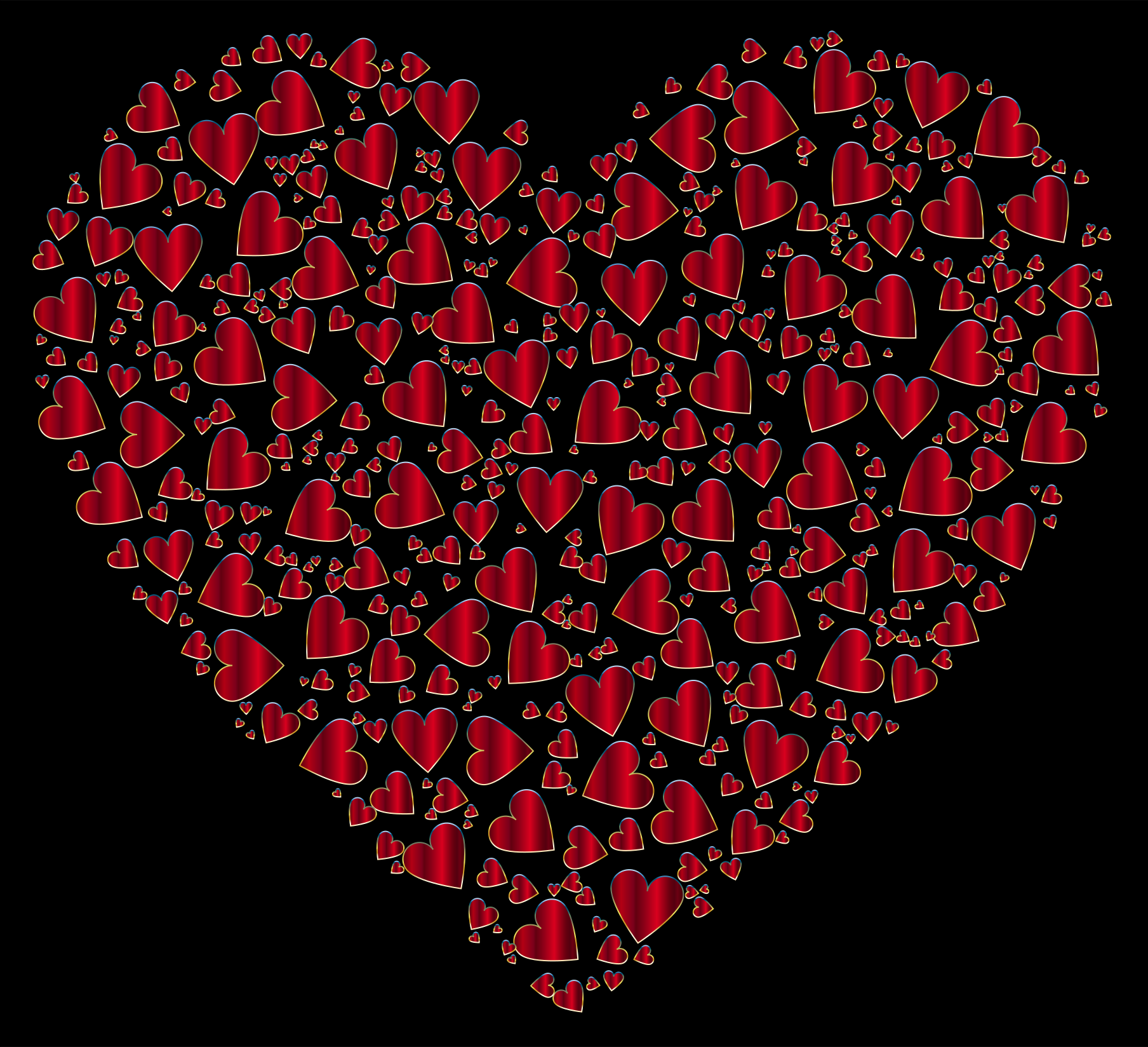 This features a large heart made up of numerous smaller hearts. These smaller hearts are scattered throughout the scene, with some located near the top left corner and others in the middle right section. The heart is predominantly red, giving it an eye-catching appearance. The overall composition creates a sense of unity and love, as each individual heart contributes to the larger heart's shape.