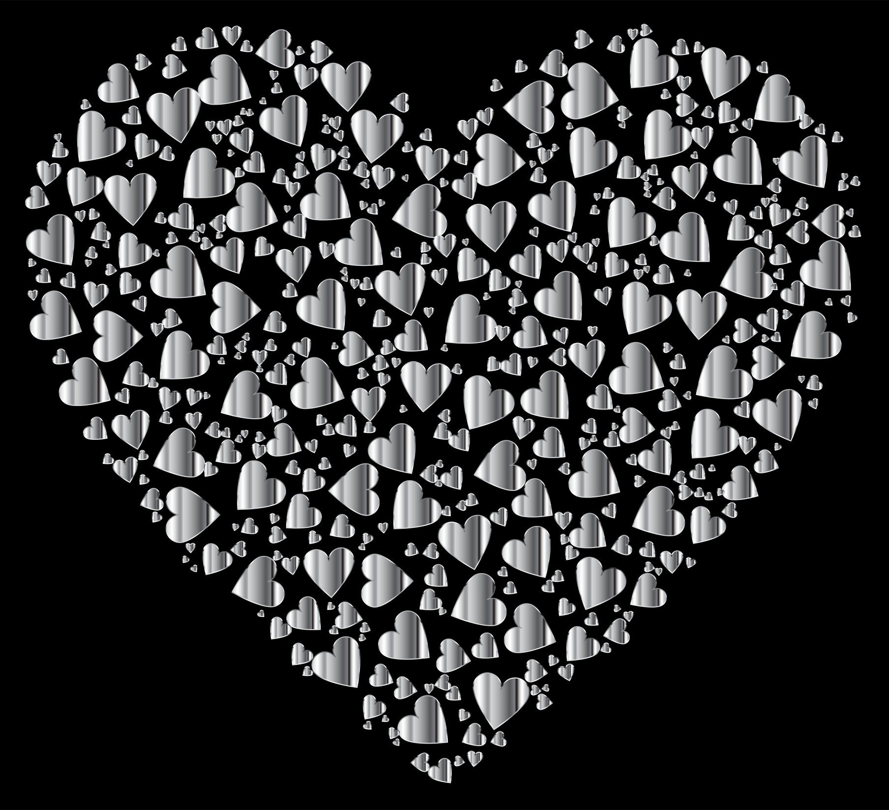 This features a large heart made up of numerous small hearts. These smaller hearts are scattered throughout the scene, with some located near the top left corner and others in the middle right section. The hearts vary in size and position, creating an interesting visual effect that highlights the intricate details within the larger heart. Overall, this image showcases a creative representation of love through the use of smaller hearts as building blocks for the main subject.