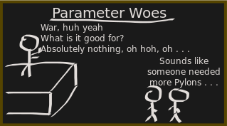 This is a comic strip that features two cartoon characters standing next to each other. One of the characters appears to be a man, while the other character seems to be a woman. They are both wearing ties and appear to be engaged in conversation with one another. The comic strip is displayed on a black background, which adds emphasis to the characters' expressions and body language. The text of the comic strip reads "Parameter Woe," suggesting that the characters may be discussing a problem or issue related to parameters. Overall, the image conveys a sense of humor and lightheartedness through its use of cartoon characters and dialogue.