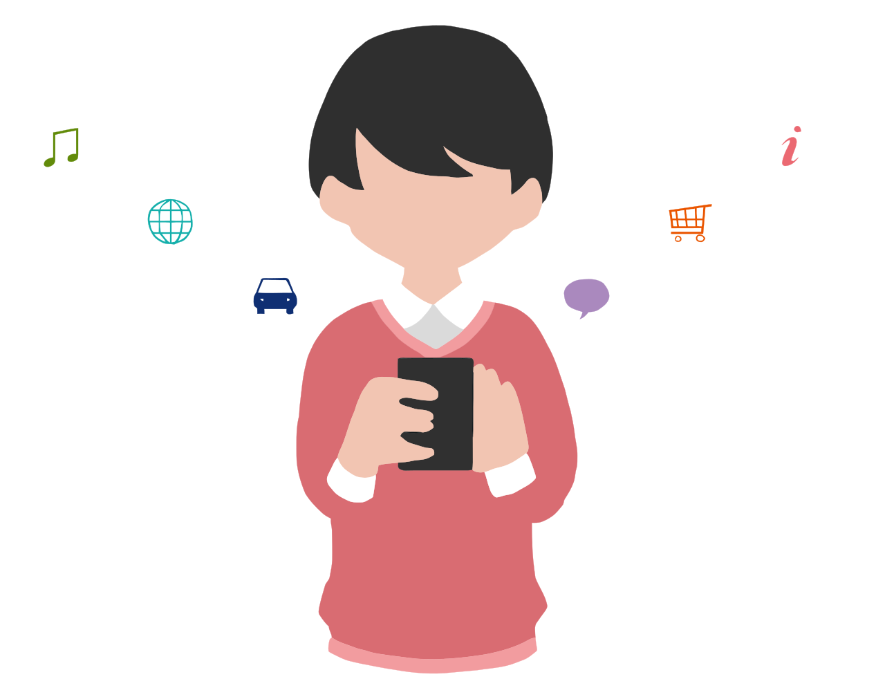 This features a cartoon illustration of a man holding a smartphone in his hand. He is surrounded by various small icons, which represent different things he can use his phone for. These include a car icon, an airplane icon, and a shopping cart icon. Additionally, there are other icons such as a music note, a speech bubble, and a book. The man appears to be engaged with the content on his smartphone, possibly browsing or communicating with others.