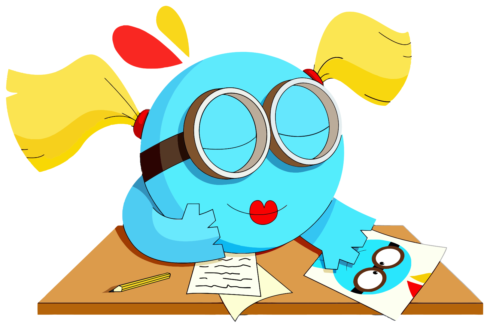 This features a blue cartoon character sitting at a desk, wearing glasses and holding a piece of paper. It appears that the character is working on an assignment or studying for an exam. There are two pairs of scissors placed near the character, possibly used for cutting out information from the paper. Additionally, there is a book located close to the character, which could be related to their work or study. The scene gives off a sense of focus and determination as the cartoon character tackles its task.