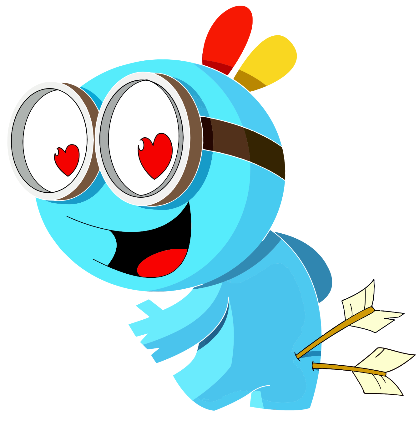 This features a blue cartoon character with googles and hearts in its eyes. It is holding an arrow in its butt, giving it a playful and humorous appearance. The character appears to be smiling as it poses for the camera, adding to its friendly and approachable demeanor. This whimsical design could be used for various purposes such as advertising or entertainment, particularly targeting younger audiences who might find the character's antics amusing and relatable.