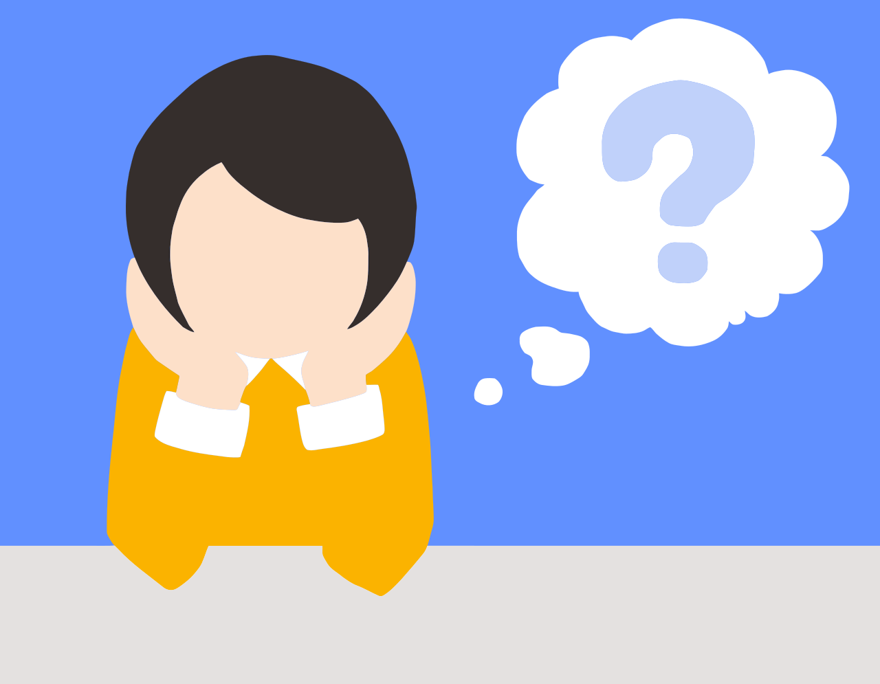 This features a cartoon character, possibly a woman or a man, sitting down with their hands on their head. They are wearing an orange shirt and appear to be deep in thought. Above the character's head is a question mark symbol, suggesting that they might be pondering something or seeking answers. The scene takes place against a blue background, which adds a contrasting color to the image.
