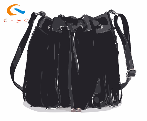 This features a black leather bag with tassels and a logo on it. The bag is large, occupying most of the frame, and has a strap that can be worn across the body or over the shoulder. The bag appears to be made from high-quality materials, giving it an elegant appearance. The tassels add a touch of sophistication to the overall design, making it stand out as a stylish accessory.