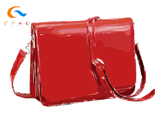 This features a red handbag with a strap, sitting on top of a white background. The bag is large and has a shiny appearance, giving it an attractive look. It appears to be made from leather material, adding to its sophisticated appearance. The bag's design and color make it stand out against the white background, drawing attention to its unique features.
