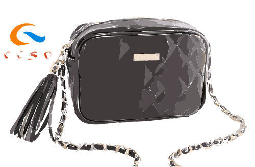 This features a black purse with a chain handle, made from leather. It is placed on a table in front of a background that has the word "CSC" written on it. This suggests that the purse may be associated with a brand or company called CSC. The purse appears to be well-made and stylish, making it an attractive accessory for any occasion.