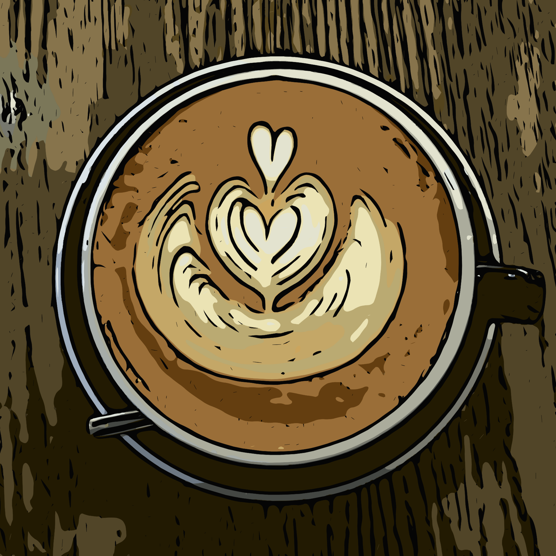 This features a close-up of a cup filled with coffee, which has a heart shape inside it. This unique design adds an artistic touch to the beverage. The cup is placed on a wooden surface, giving the scene a warm and cozy atmosphere. The heart shape in the coffee not only makes for an appealing visual but also symbolizes love or affection, adding a personal touch to the drink.