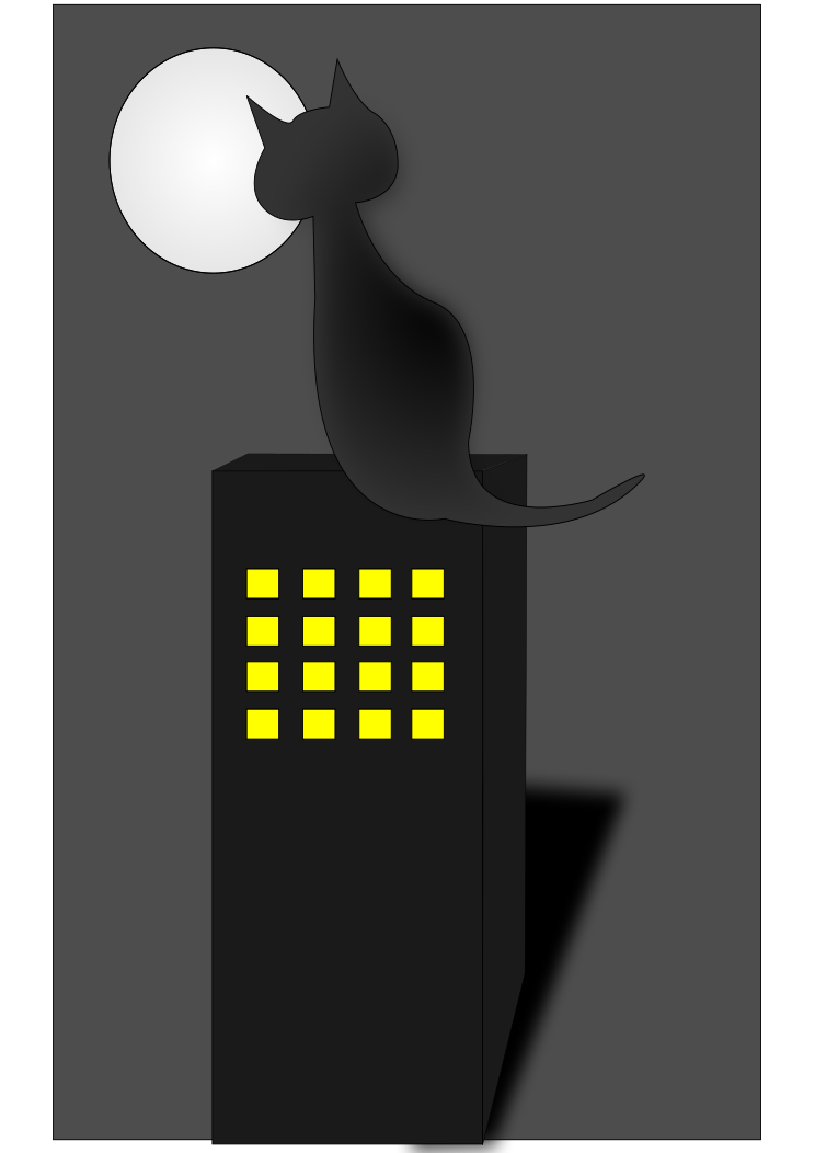 This features a black cat sitting on top of a building, looking up at the moon. The scene is set against a dark background that contrasts with the cat's silhouette and the brightness of the moon. The cat appears to be in a relaxed position as it gazes into the night sky. This illustration captures the serene atmosphere often associated with cats and their love for observing the world around them, especially during nighttime hours when they are more active.