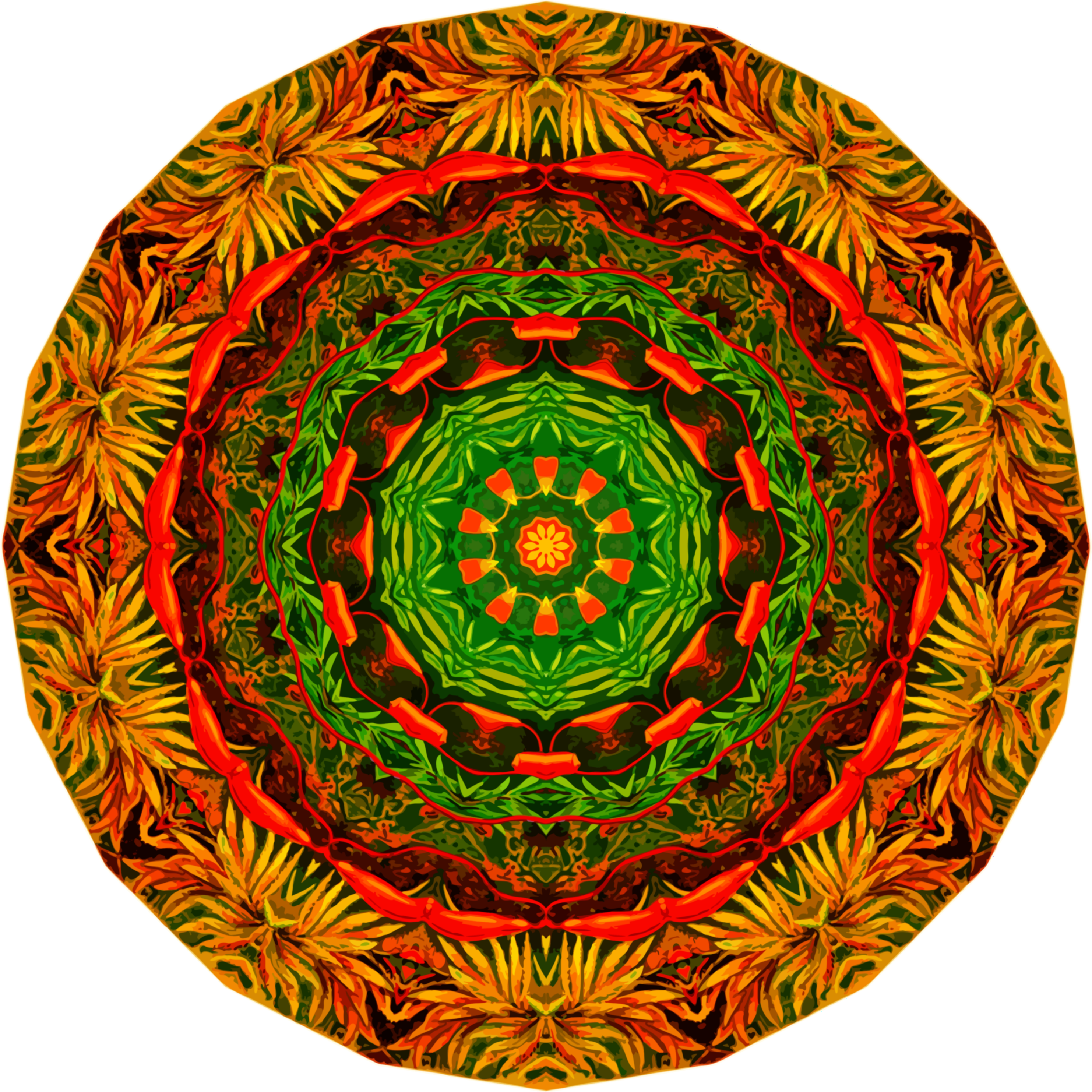 This features a circular design with an intricate pattern of green and red leaves. The design is created by rotating wedges around the center, giving it a symmetrical appearance. The colors used in this artwork are predominantly green and orange, creating a vibrant and eye-catching effect. This unique design could be used for various purposes such as wallpaper or decorative items, adding a touch of nature to any space.