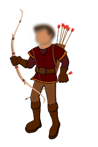 This features a cartoon illustration of an archer dressed in medieval clothing. He is holding a bow and arrow, with several arrows on his back. His face is blurred out, giving the impression that he is not fully visible. The archer's attire includes a brown outfit, which complements the overall theme of the illustration. This artistic representation captures the essence of an archer in action, showcasing their skill and dedication to the sport.