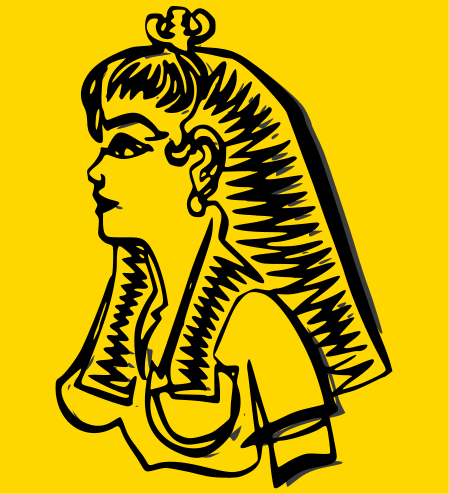 This features a drawing of an Egyptian queen, possibly Cleopatra. She is depicted with long black hair and wearing a yellow dress. The drawing has a yellow background that complements the color of her attire. The portrait captures the essence of this ancient queen's appearance, showcasing her beauty and elegance.