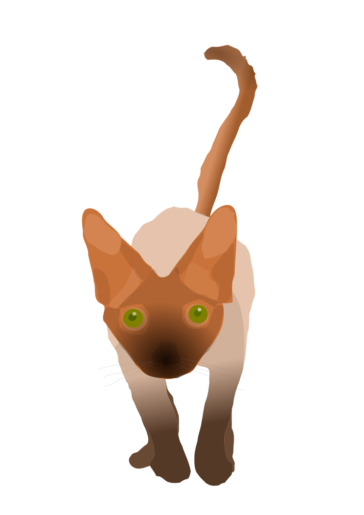 This features a brown and white cat with green eyes, standing on its hind legs. It appears to be an illustration or drawing of the cat rather than a real-life photograph. The cat's body is positioned in such a way that it seems to be walking towards the viewer, capturing attention and creating a sense of movement within the image. Its eyes are focused on something off-camera, adding depth and interest to the scene.
