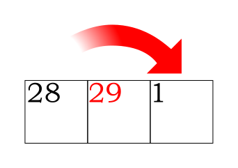 This displays a calendar with the numbers 28, 29, and 1 written on it. It is likely that this is an illustration of the last day of February or the first day of May. The red arrow pointing upwards in the top right corner indicates that the focus is on the date at the top of the calendar. This could be a visual representation of the transition from one month to another, highlighting the change in seasons or the passage of time.