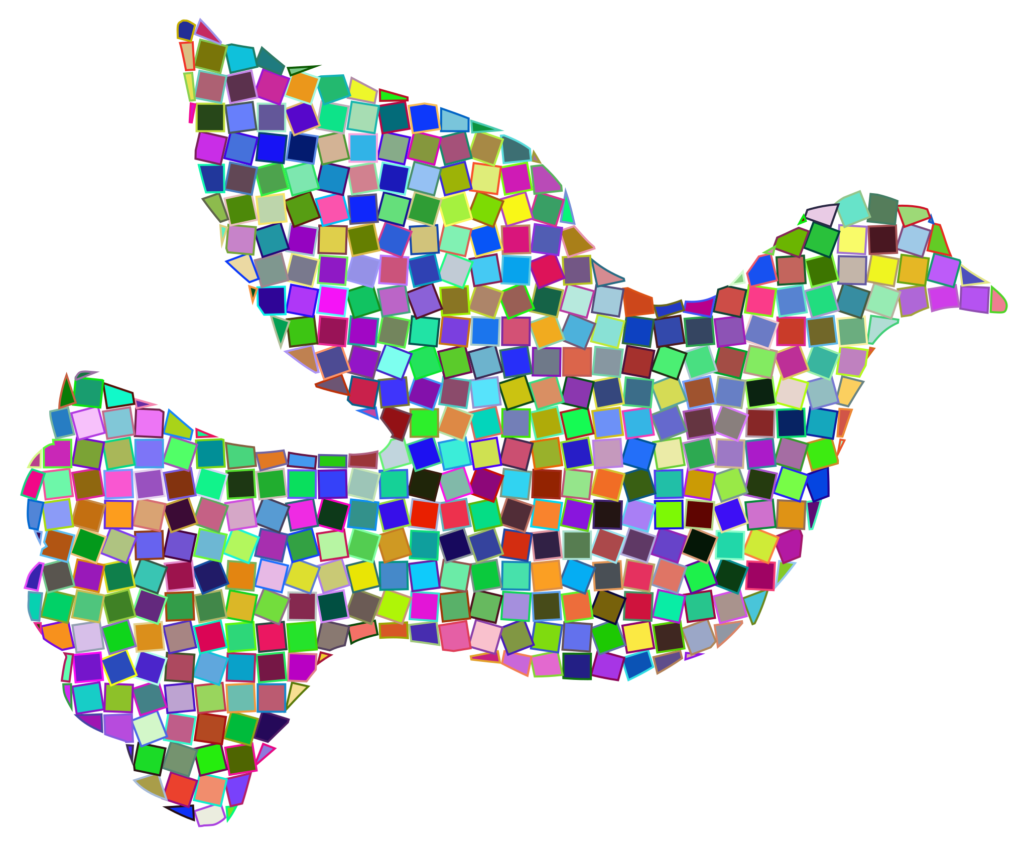 This features a colorful dove made out of small, colorful dots. It is in mid-flight and appears to be flying towards the viewer. The dove's wings are spread wide, showcasing its vibrant colors and intricate design. The combination of various shades and hues creates an eye-catching and lively appearance for this unique artwork.