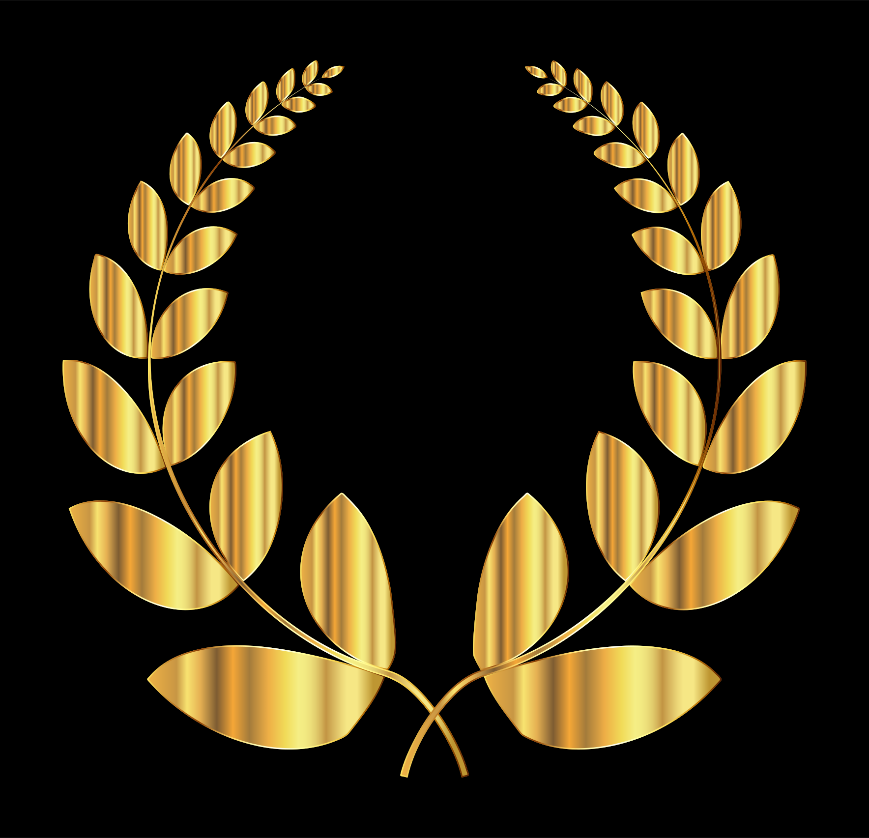 This features a gold laurel wreath, which is an ornate design made up of intertwined leaves. This decorative element is often used to symbolize achievement or victory. In this case, the wreath appears to be part of a logo or emblem, with two distinctive golden leaves visible in the foreground and background. The overall effect is one of elegance and sophistication, as the gold color evokes feelings of prestige and accomplishment.