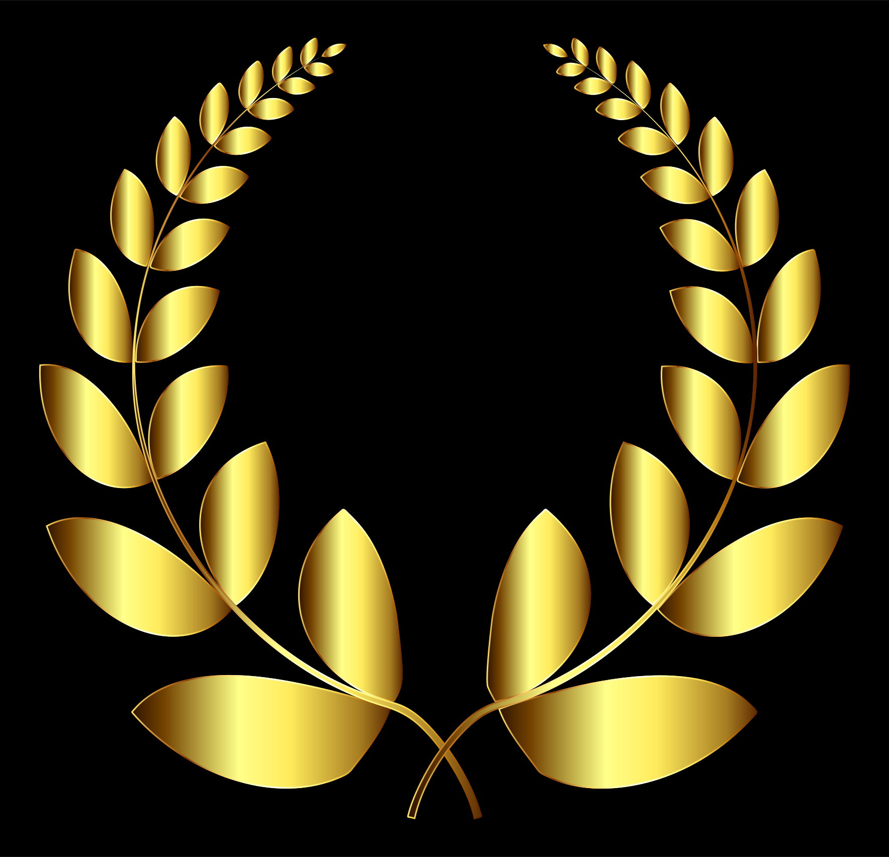 This features a black background with two golden laurels, or wreaths, placed on top of each other. Each wreath is adorned with gold leaves and has a small golden bow at the bottom. These decorative elements create an elegant and sophisticated appearance. The overall design suggests that this could be used as a symbol or logo for various purposes such as awards, achievements, or even artwork.