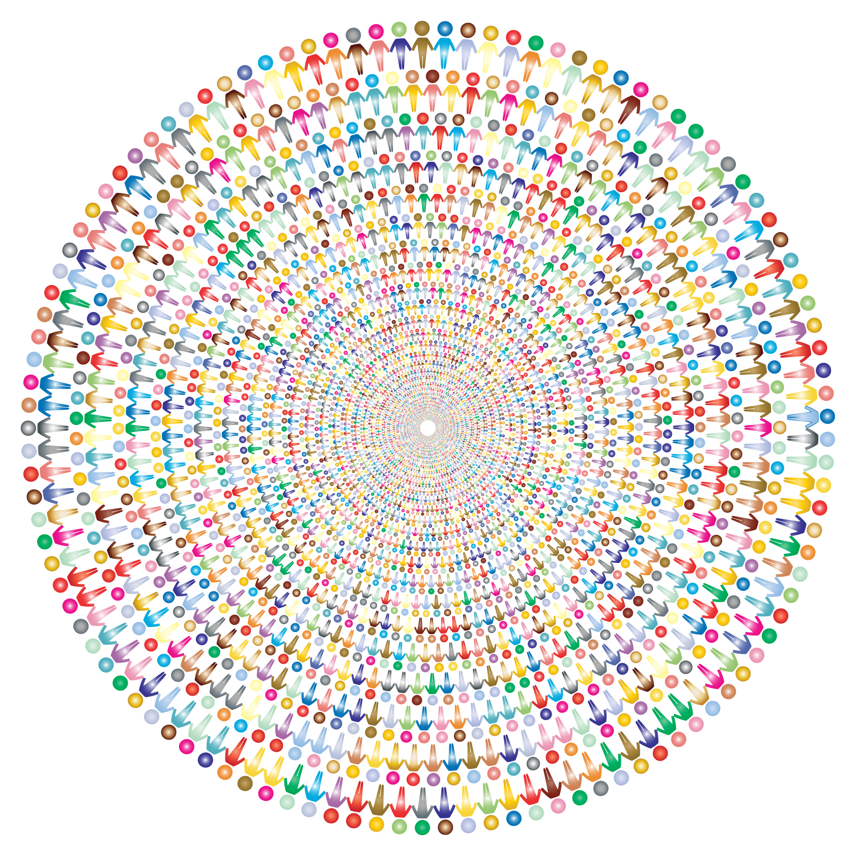 This features a large, colorful circle made up of many small circles. Each small circle is filled with people, creating an intricate and visually appealing pattern. There are at least 13 distinct groups of people visible in the image, each occupying their own small circle within the larger circle. The people in these small circles vary in size and position, giving a sense of depth to the overall composition. The arrangement of the circles creates an illusion of a three-dimensional space, making it appear as though the people are standing on top of one another or overlapping. This unique artistic display is both captivating and thought-provoking, inviting viewers to explore its intricate details further.