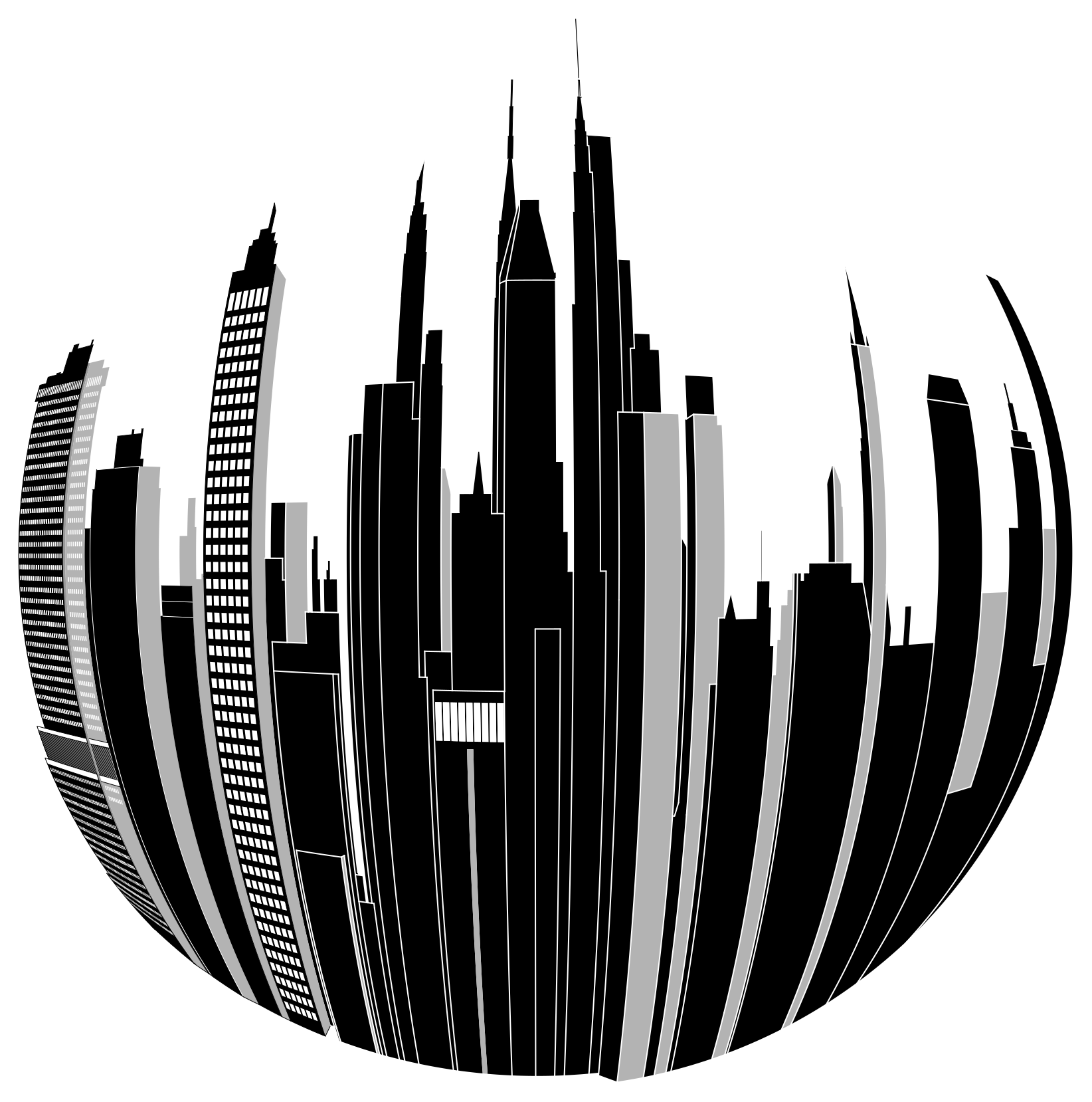 This features a black and white silhouette of a city skyline, with tall buildings towering over the landscape. The cityscape is composed of multiple skyscrapers, some taller than others, creating an impressive urban scene. The buildings are arranged in various positions, giving the impression that they are part of a bustling metropolis. The silhouette effect adds depth and dimension to the image, making it visually striking and evoking a sense of mystery.