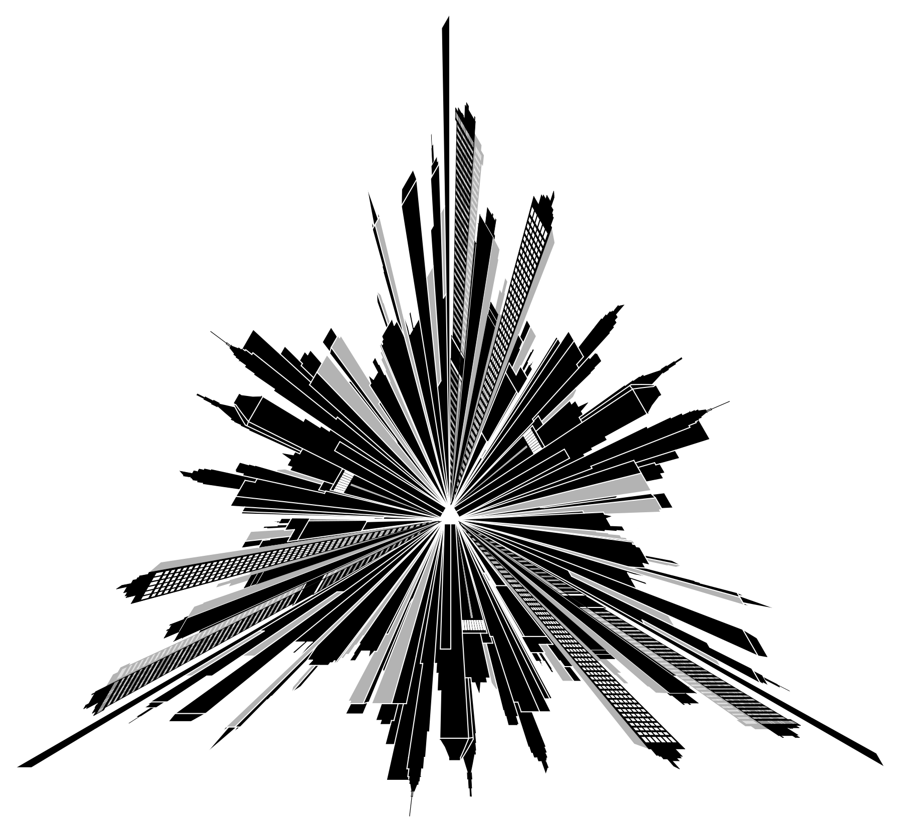This features a unique and creative representation of a city skyline. Instead of using traditional shapes or images, the artist has crafted the buildings in the shape of a triangle. This artistic approach gives the scene an interesting and eye-catching appearance. The triangular buildings are arranged in such a way that they create a sense of depth and dimension within the image. Overall, this black and white composition showcases the city's iconic architecture while adding a touch of creativity to the visual representation.