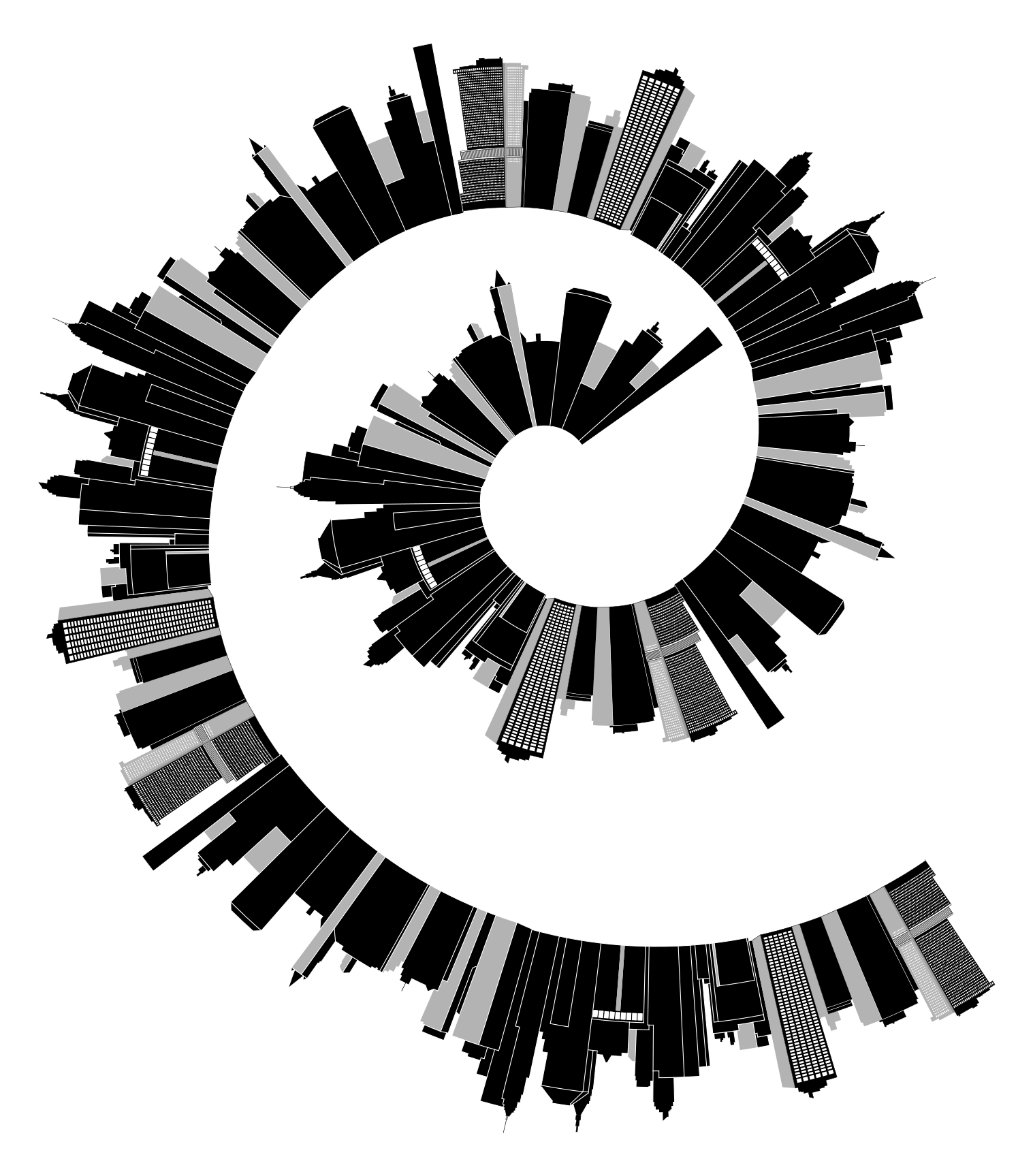 This features a unique and creative representation of a cityscape skyline. It is composed of multiple spirals, each containing various buildings in black and white. These spirals are arranged in such a way that they create an intricate pattern resembling the shape of a circle or a wheel. The buildings within these spirals vary in size and height, adding depth to the overall composition. This artistic representation of a cityscape skyline is both visually appealing and thought-provoking.