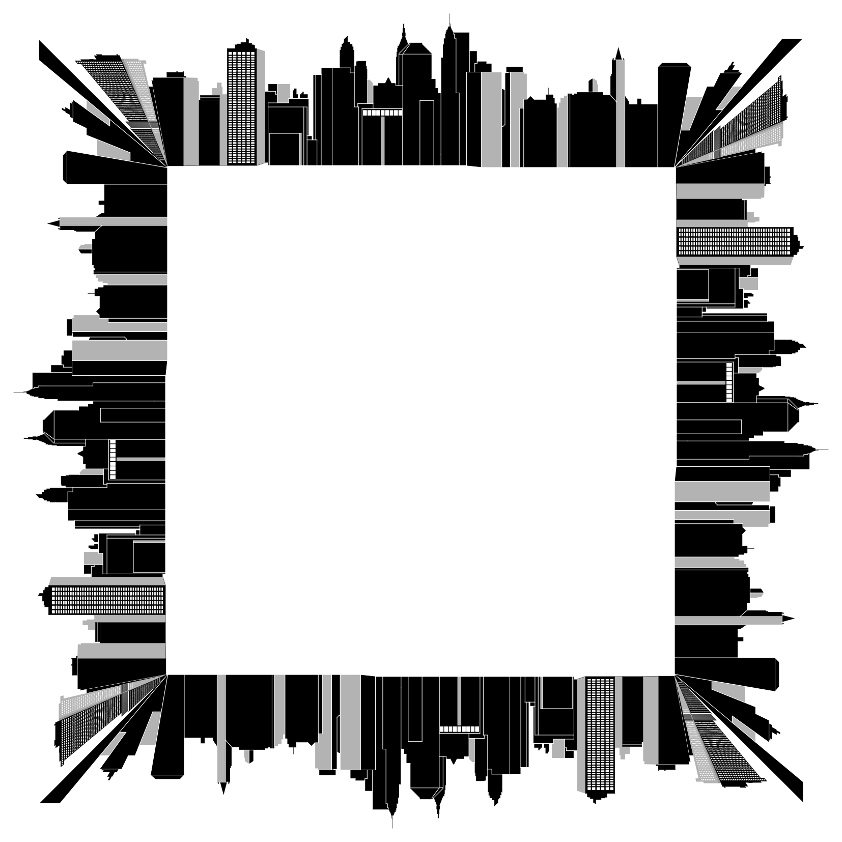 This is a black and white photo of a cityscape, featuring several skyscrapers. The buildings are arranged in such a way that they form the shape of a square frame. This unique composition creates an interesting visual effect, as it appears to be a collage or montage of various buildings within the city. The image captures the essence of urban life and architecture, showcasing the iconic structures that define modern cities.