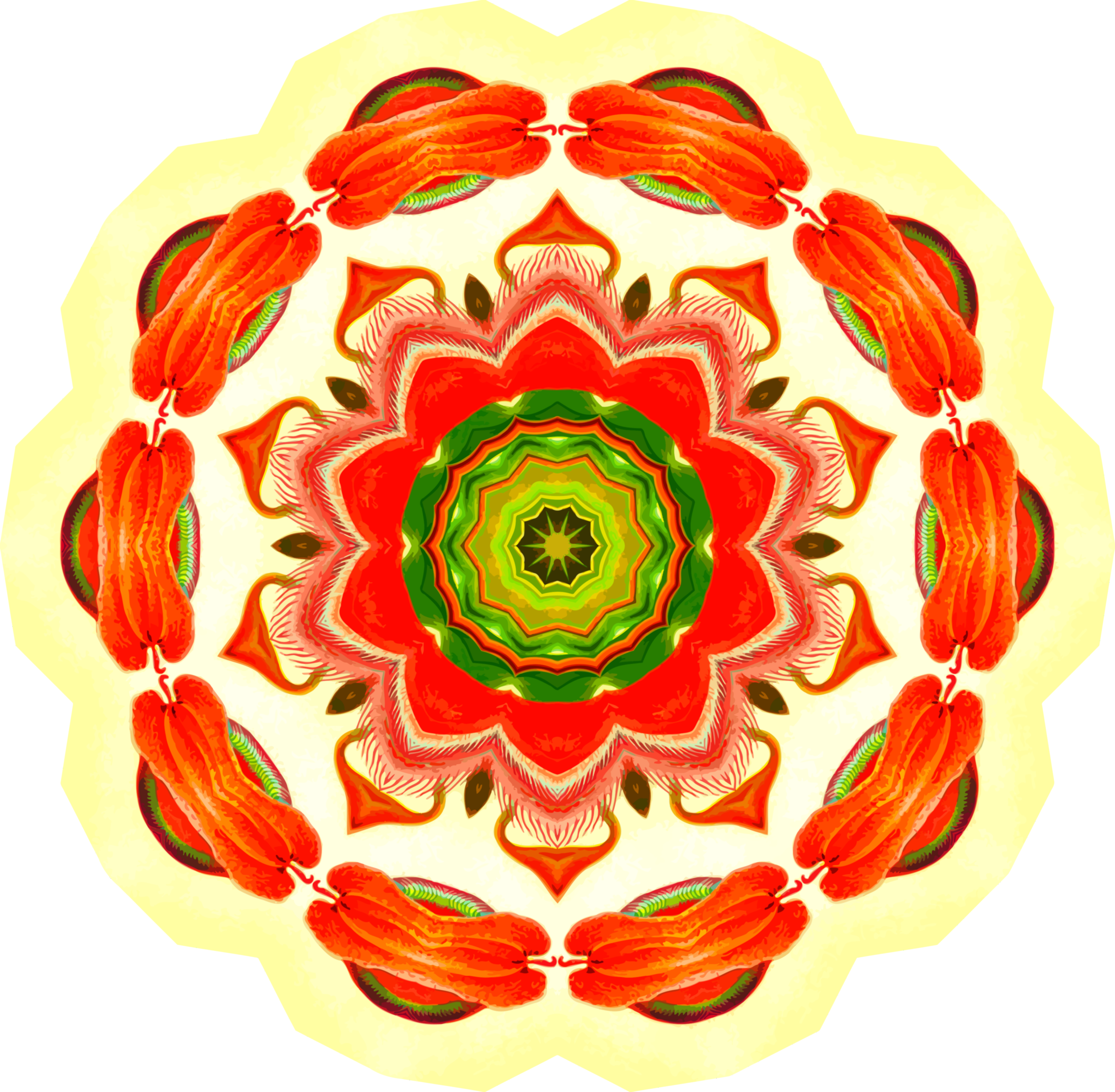 This features a large, colorful circle made up of many small circles. Each small circle is filled with red and green colors, creating an eye-catching pattern. The design appears to be inspired by the work of Ernst Haeckel, who was known for his intricate drawings of pitcher plants. The image itself has been created using a combination of PNGs in Paint.net and vectorization in Vector Magic, resulting in a visually striking and detailed piece of artwork.