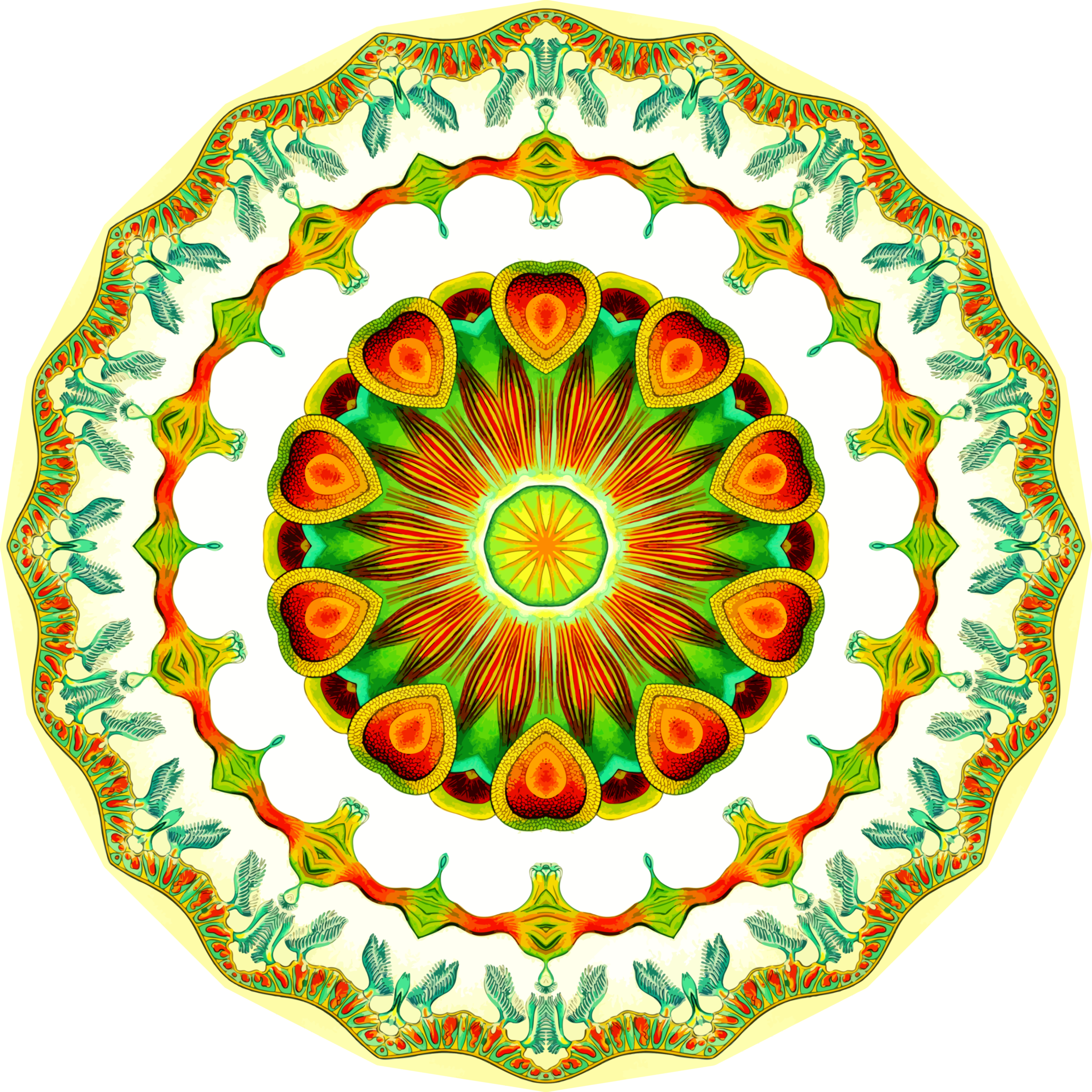 This features a colorful, circular design with an intricate pattern of leaves and flowers. The center of the circle is adorned with a sun-like shape, adding to its visual appeal. The entire composition appears to be a vibrant and lively art piece that captures the viewer's attention. The use of various colors and shapes creates a sense of depth and complexity in the design, making it an interesting focal point for any space where it is displayed.