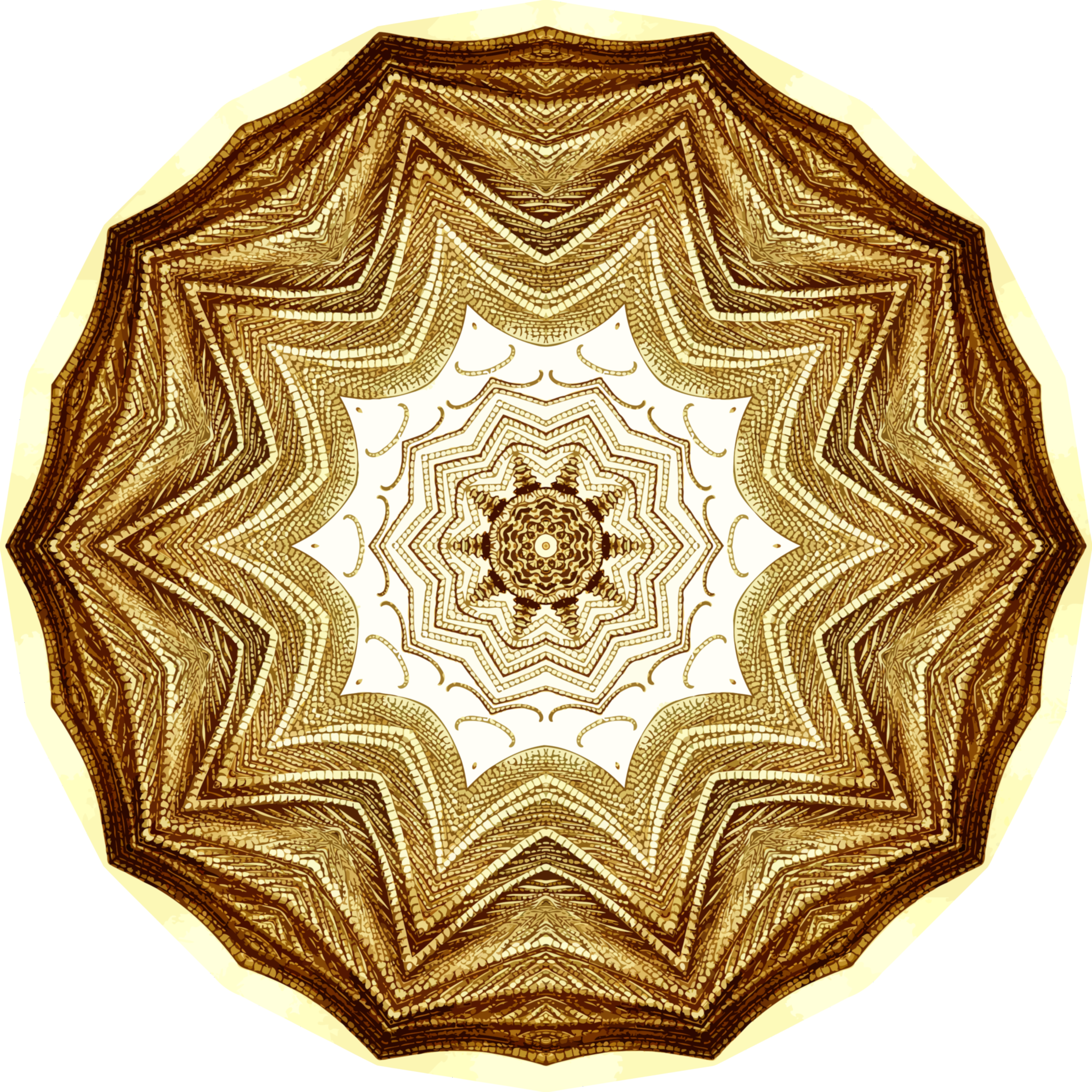 This features a large, intricate design that resembles an abstract star. This star has ten points and is made up of various shapes and patterns, giving it a unique and eye-catching appearance. It is predominantly brown in color, with some white accents adding contrast to the overall design. In the center of this star, there is a smaller, white star that further enhances its visual appeal. The entire image has a round outline, emphasizing the circular shape of the main design element.