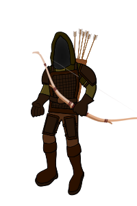 This features a cartoon-like character dressed in medieval armor, holding a bow and arrow. The character is wearing a hooded outfit with a mask covering his face, giving him an air of mystery. He appears to be the main focus of the scene, standing tall against a backdrop that could be either a wall or another character. The character's attire suggests a strong connection to archery and medieval times, making it an interesting and unique visual representation.