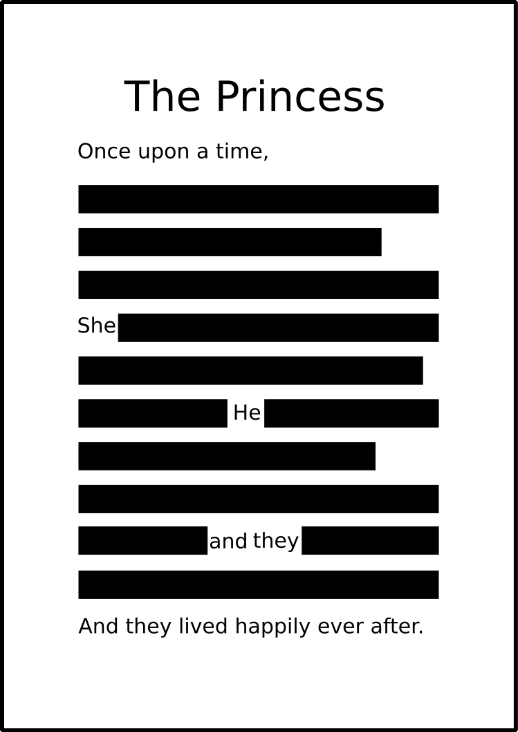 This is a black and white illustration of a story titled "The Princess." The first line of the story is written below the title, but most of the lines are redacted or blacked out. This suggests that the story has been censored or edited in some way. However, the last line of the story remains visible, indicating that it may be the only uncensored part of the narrative. The illustration gives a sense of mystery and intrigue to the story, as the reader is left to wonder about the content that has been hidden from view.