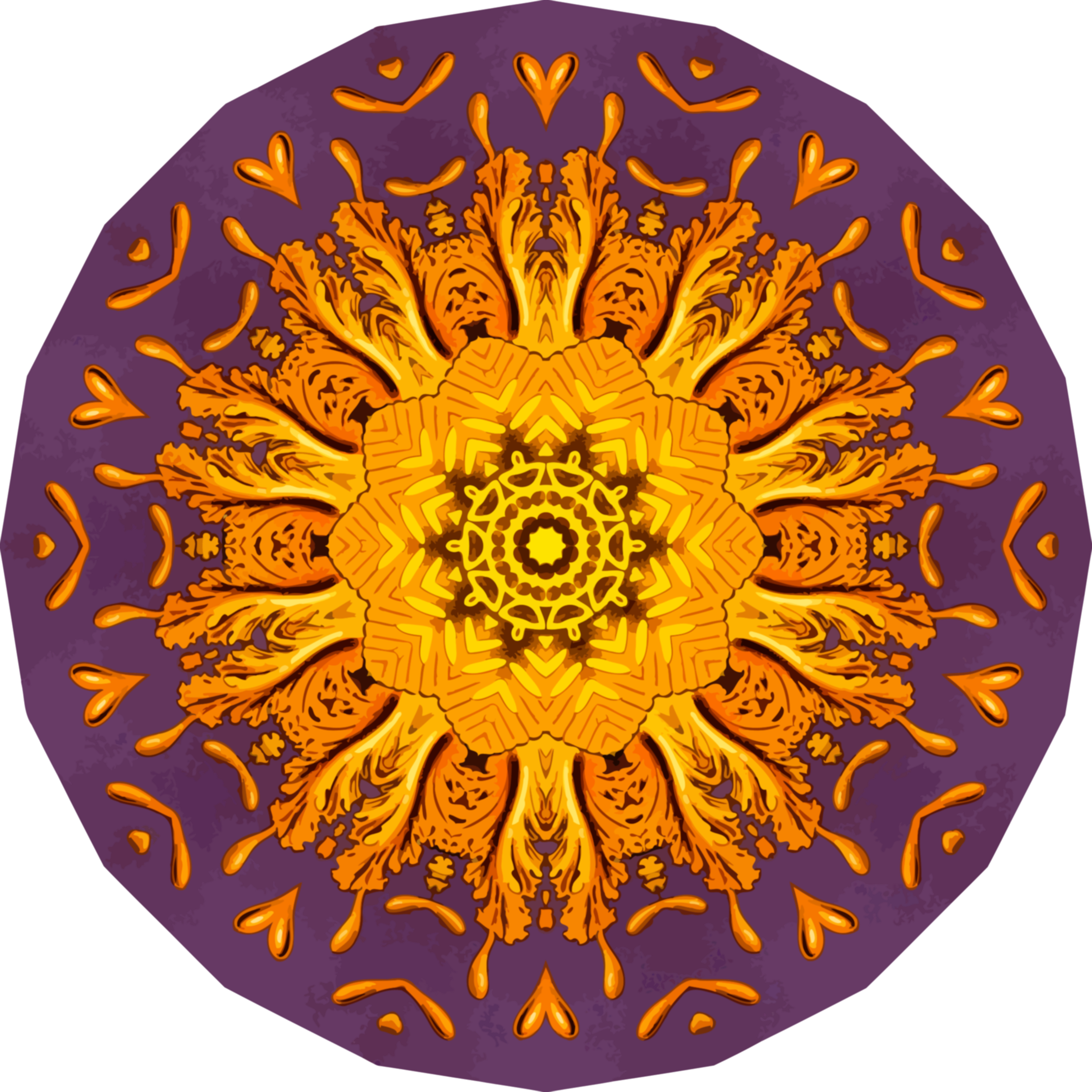 This features a purple and yellow circular design with an intricate pattern. This artistic piece is reminiscent of Ernst Haeckel's jellyfish drawings, which were created using repeated rotations of wedges around a central point. The design showcases a combination of colors, including orange and yellow hues, creating a visually appealing and unique pattern. The circular shape of the artwork adds to its overall charm and makes it an eye-catching piece that can be appreciated by viewers.
