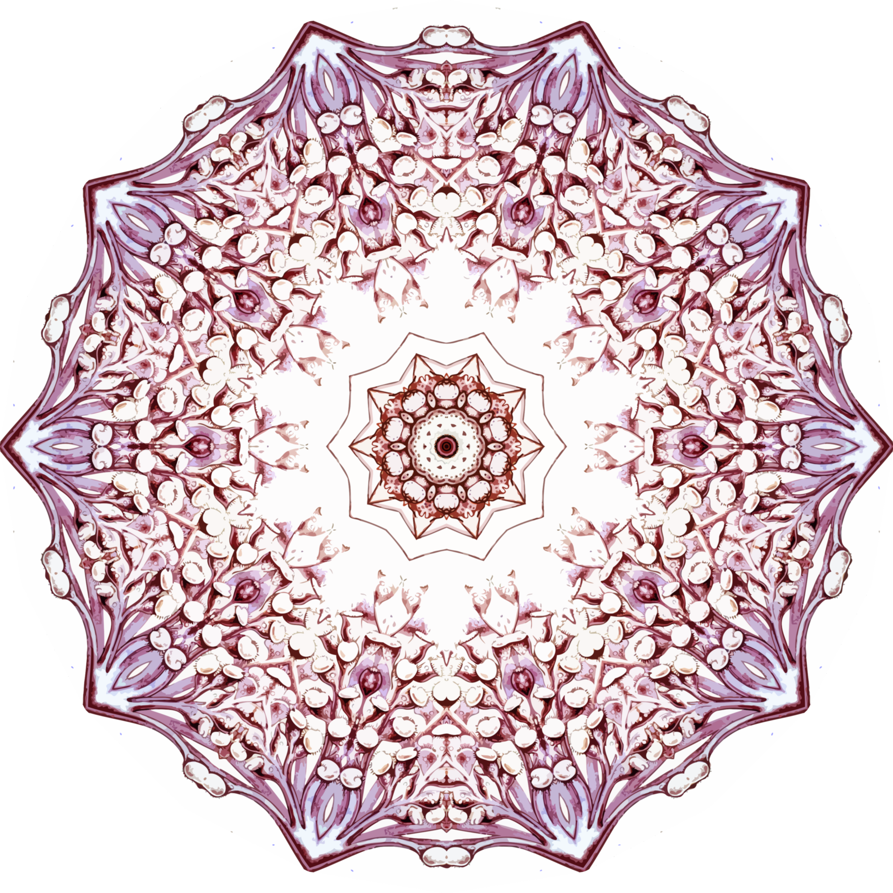 This features a beautifully crafted, intricate design that resembles an ornate purple and white mosaic. This artistic piece is composed of numerous small circles arranged in a circular pattern, creating a captivating visual effect. The design appears to be inspired by the work of Ernst Haeckel, who was known for his detailed illustrations of marine organisms. The intricate patterns and colors make this design an eye-catching centerpiece that can be appreciated from various angles and distances.