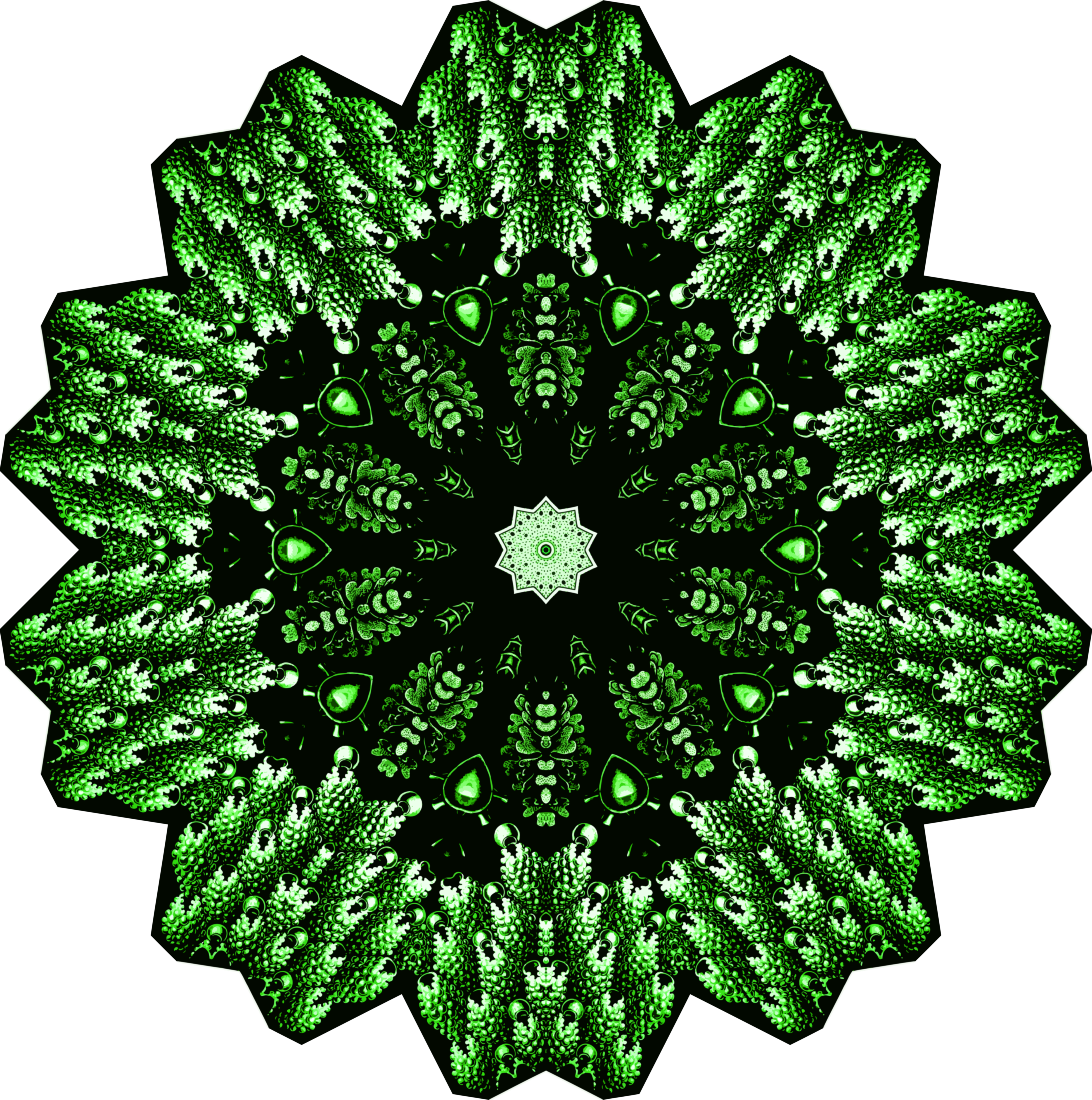 This features a large, intricate design that resembles an aquatic invertebrate. This artistic piece is created using a combination of green and white colors to give it a vibrant appearance. The design appears to be inspired by Ernst Haeckel's work, as it showcases the beauty found within nature. The image itself has been digitally rendered, likely through the use of software such as Paint.net or Vector Magic. This method allows for precise control over the design and its elements, resulting in a visually stunning piece that captures the essence of the aquatic creature's form.