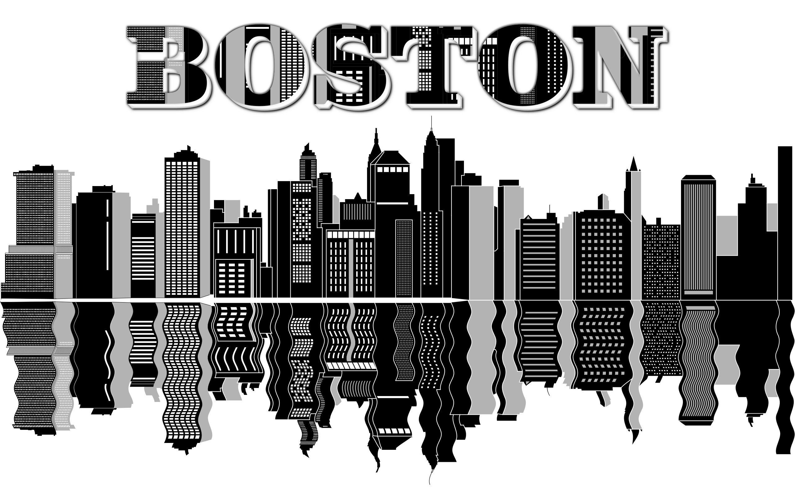 This is a black and white picture of the Boston skyline. The skyline is reflected in the water, creating an interesting visual effect. Above the skyscrapers, the word "Boston" is written using the same patterns as the buildings themselves, giving it a unique appearance. This artistic representation of the cityscape showcases the iconic architecture and layout of Boston's skyline.