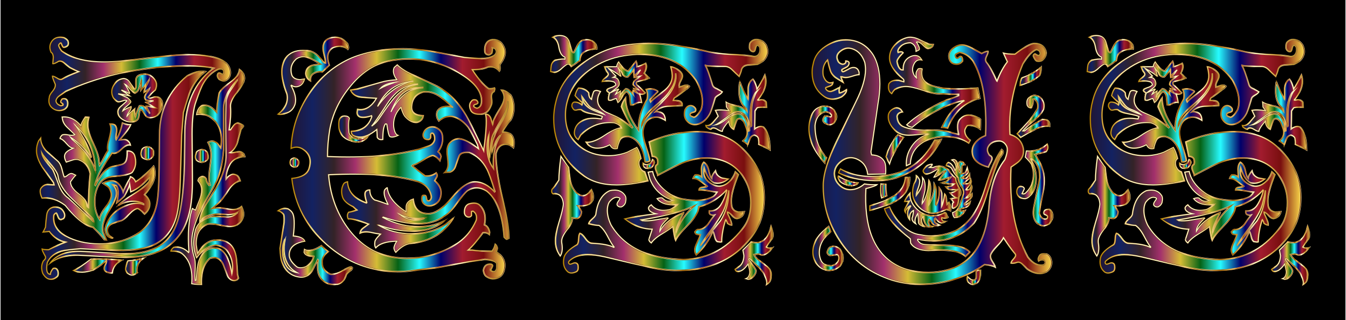 This features a colorful and artistic display of the word "Jesus" written in various colors. The letters are arranged in an eye-catching manner, creating a visually appealing design. The different colors used for each letter add depth and interest to the overall composition, making it an attractive piece of typography. This creative representation of the name Jesus showcases the artist's skill in combining form and function while adding a touch of visual appeal.