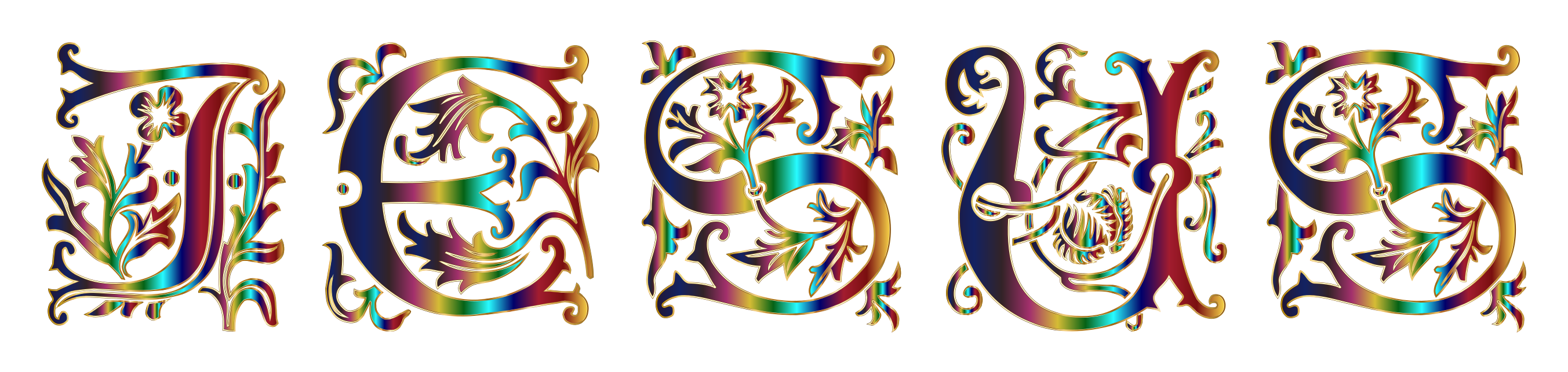 This features a series of four different colored letters arranged in an artistic manner. These letters spell out the word "Jesus" and are displayed in various colors, including red, green, yellow, and blue. Each letter is uniquely designed with intricate details that make them visually appealing. The arrangement of these letters creates a sense of harmony and balance within the composition. Overall, this image showcases an elegant typography display of the name "Jesus."