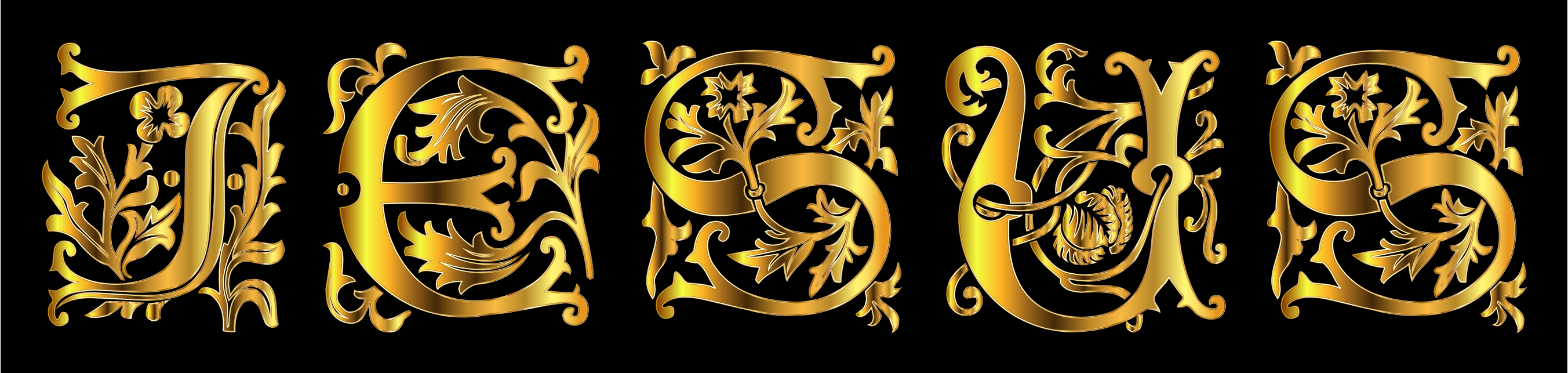 This features a decorative design with the word "Jesus" written in an elegant manner. The text is surrounded by ornate gold lettering, giving it a sophisticated appearance. The letters are arranged in a way that makes them stand out against the background, creating a visually appealing composition. This artwork could be used for various purposes such as religious or inspirational decorations, book covers, or even as a piece of wall art to inspire and uplift those who view it.