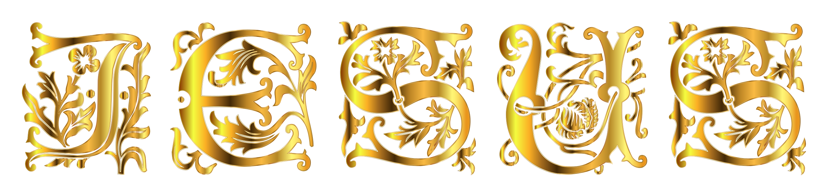 This features a series of four different gold letters that spell out the word "Jesus." Each letter is adorned with intricate designs, giving them an elegant appearance. The letters are arranged in a row, with each one slightly overlapping the others to create a cohesive and visually appealing display. The overall effect of this arrangement creates a sense of unity and harmony, showcasing the beauty of the word "Jesus" through its artistic presentation.